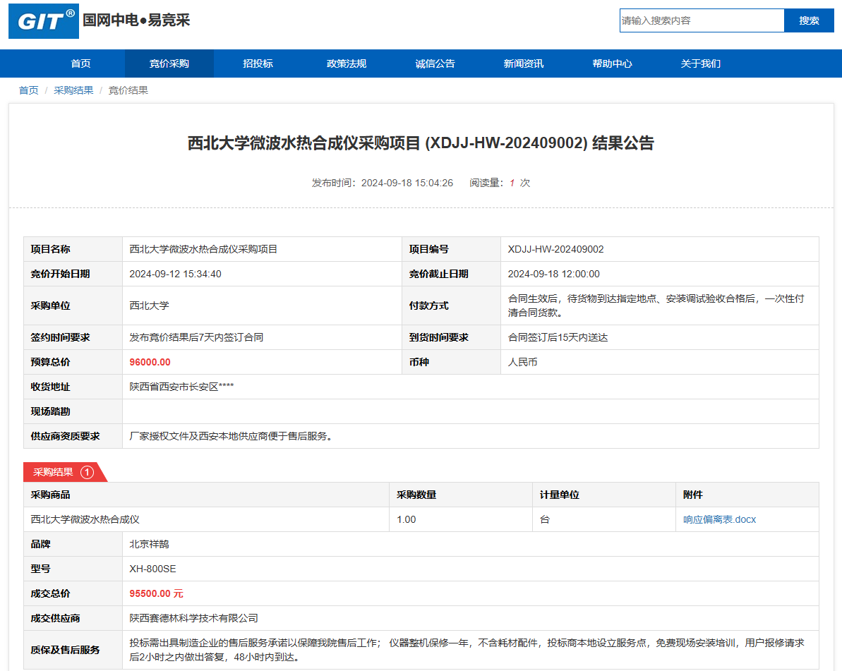 九游会在线登录官网微波水热合成仪采购项目 (XDJJ-HW-202409002)竞价结果公告 作者: 编辑: 时间:2024-09-18 原公告链接:https://www.ejingcai.com.cn/site/bidding/detail/12667