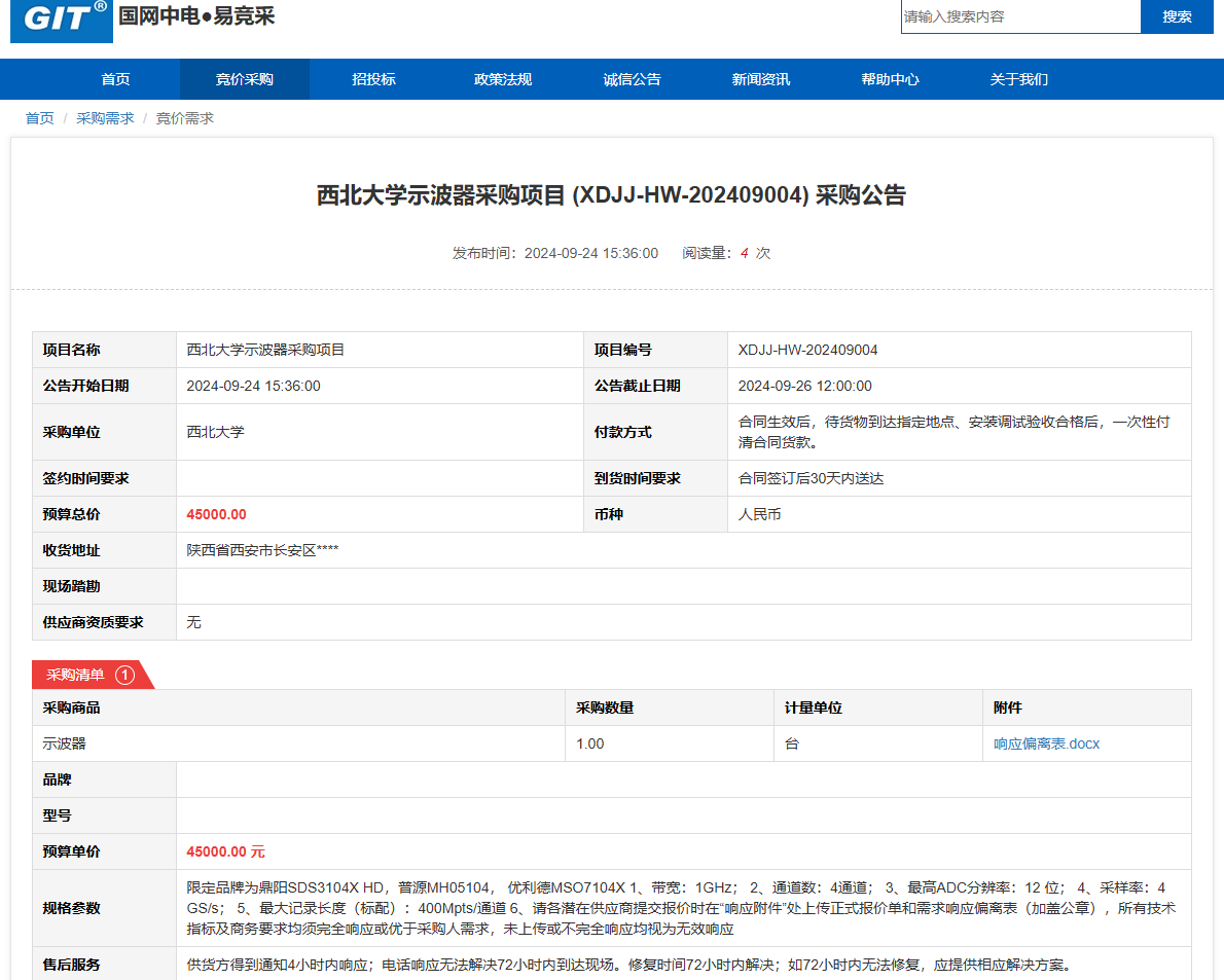 九游会在线登录官网示波器采购项目 (XDJJ-HW-202409004)竞价采购公告 作者: 编辑: 时间:2024-09-24 原公告链接:https://www.ejingcai.com.cn/site/bidding/detail/12860