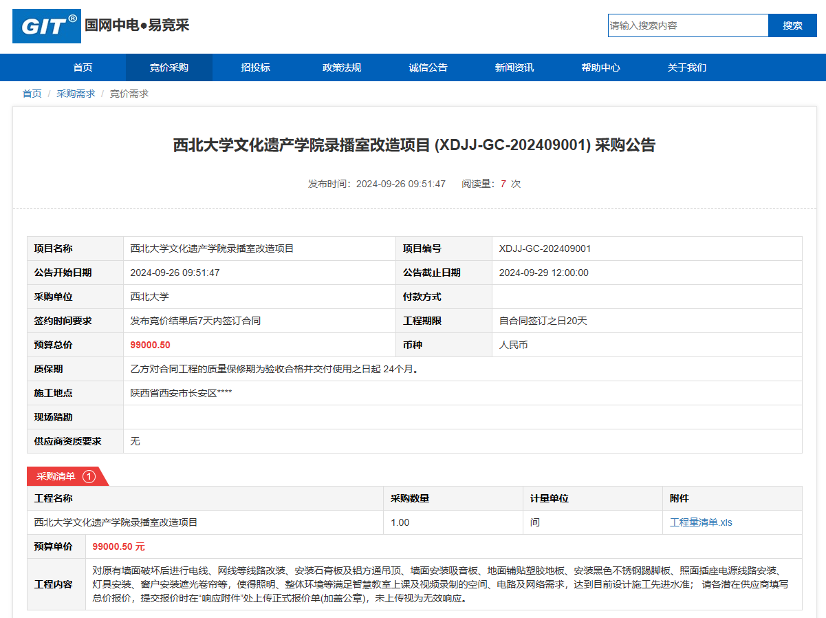 九游会在线登录官网文化遗产学院录播室改造项目 (XDJJ-GC-202409001)竞价采购公告 作者: 编辑: 时间:2024-09-26 原公告链接:https://www.ejingcai.com.cn/site/bidding/detail/12907