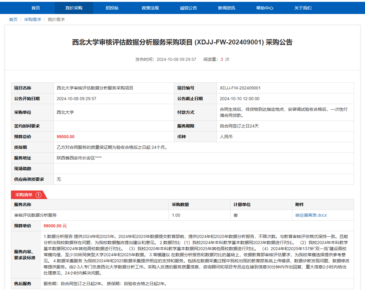 九游会在线登录官网审核评估数据分析服务采购项目(XDJJ-FW-202409001)竞价采购公告 作者: 编辑: 时间:2024-10-08 原公告链接:https://www.ejingcai.com.cn/site/bidding/detail/13071