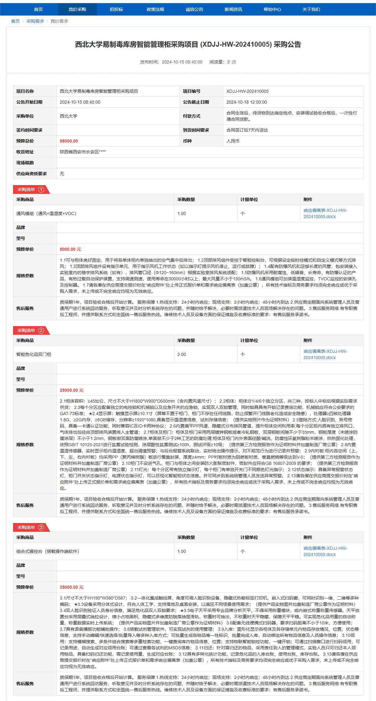 九游会在线登录官网易制毒库房智能管理柜采购项目(XDJJ-HW-202410005)竞价采购公告 作者:采购与招标办公室 编辑: 时间:2024-10-15 原公告链接:https://www.ejingcai.com.cn/site/bidding/detail/13297