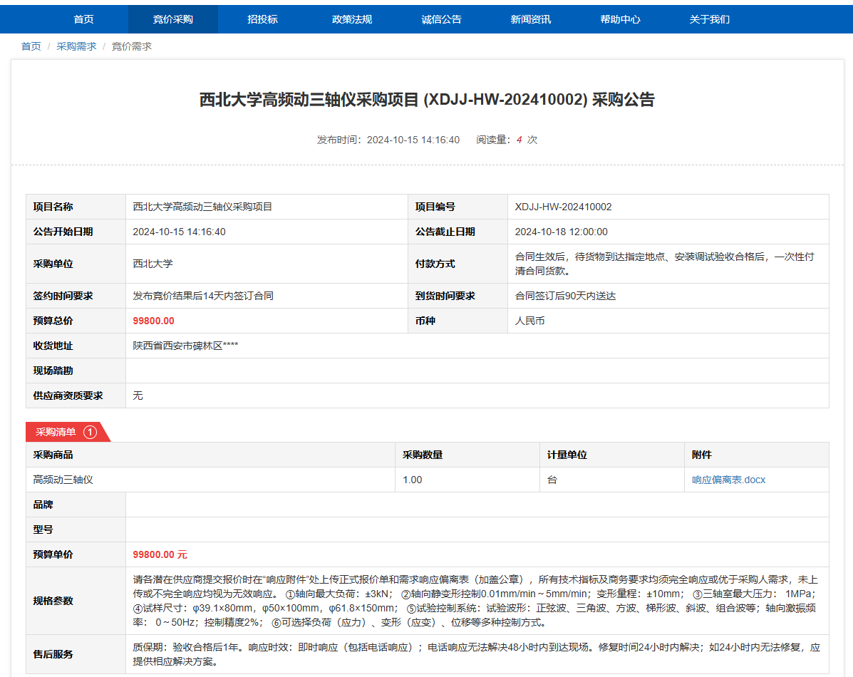 九游会在线登录官网高频动三轴仪采购项目(XDJJ-HW-202410002)竞价采购公告 作者:采购与招标办公室 编辑: 时间:2024-10-15 原公告链接:https://www.ejingcai.com.cn/site/bidding/detail/13317