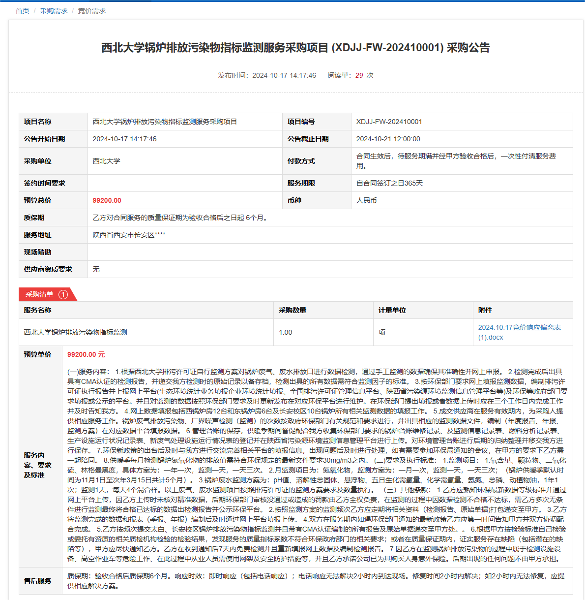 九游会在线登录官网锅炉排放污染物指标监测服务采购项目(XDJJ-FW-202410001)竞价采购公告 作者:采购与招标办公室 编辑: 时间:2024-10-18 原公告链接:https://www.ejingcai.com.cn/site/bidding/detail/13425