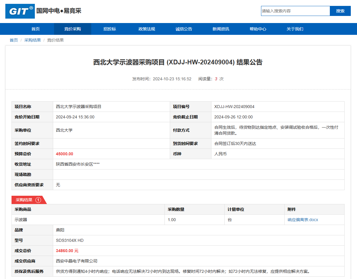 九游会在线登录官网示波器采购项目(XDJJ-HW-202409004)竞价结果公告 作者:采购与招标办公室 编辑: 时间:2024-10-23 原公告链接:https://www.ejingcai.com.cn/site/bidding/detail/13693