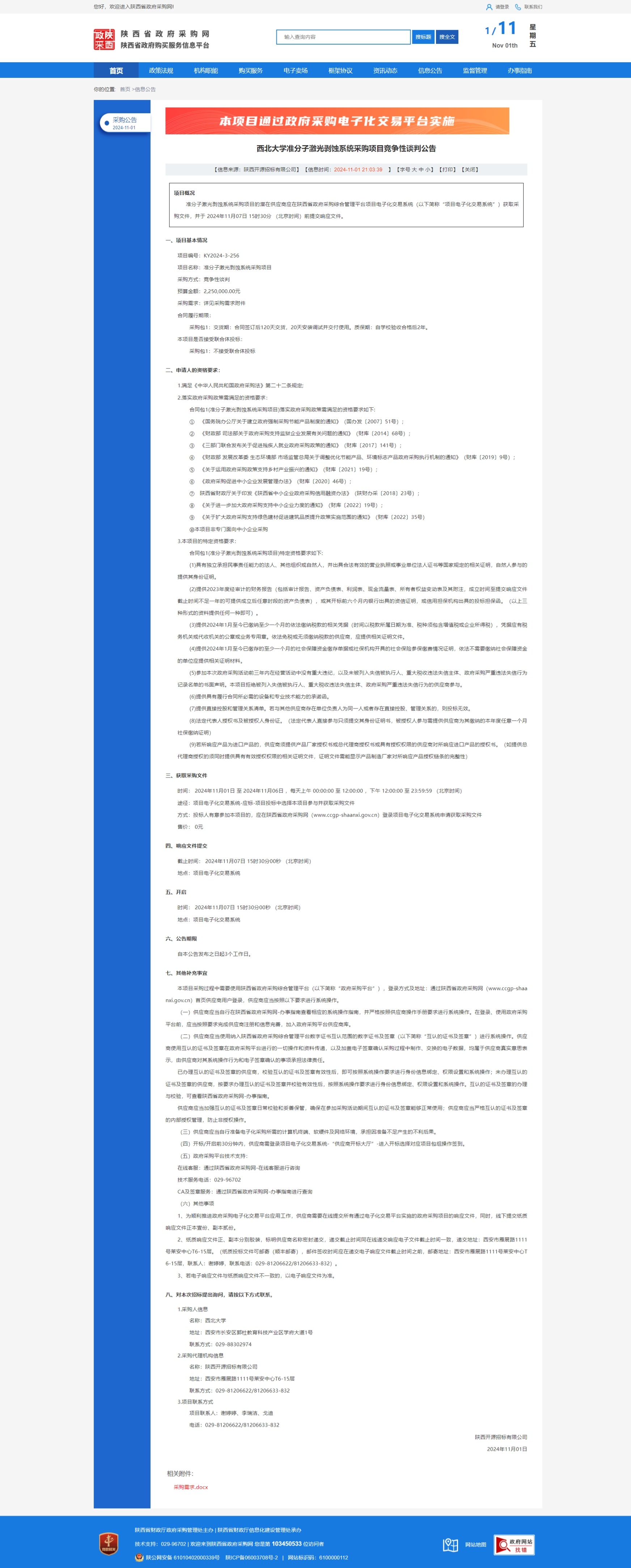 九游会在线登录官网准分子激光剥蚀系统采购项目竞争性谈判公告 作者: 编辑: 时间:2024-11-01 原公告链接:https://www.ccgp-shaanxi.gov.cn/freecms/site/shaanxi/ggxx/info/2024/8a69c251921857370192e7cd1e6468e7.html?noticeType=001013¬iceId=41ff9c47-9853-11ef-8063-08c0eb20c666
