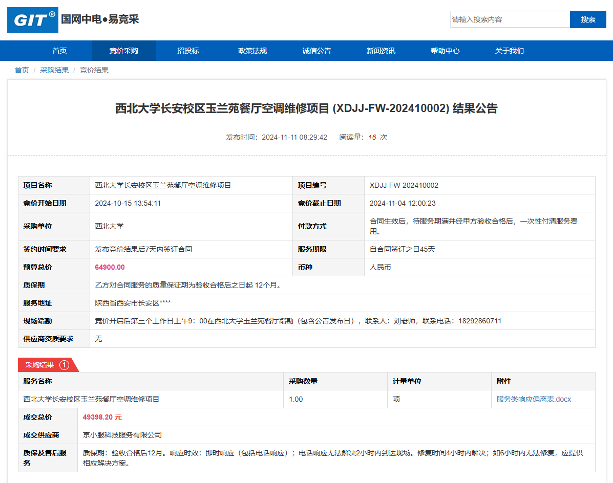 九游会在线登录官网长安校区玉兰苑餐厅空调维修项目(XDJJ-FW-202410002)竞价结果公告 作者:采购与招标办公室 编辑: 时间:2024-11-11 原公告链接:https://www.ejingcai.com.cn/site/bidding/detail/14578