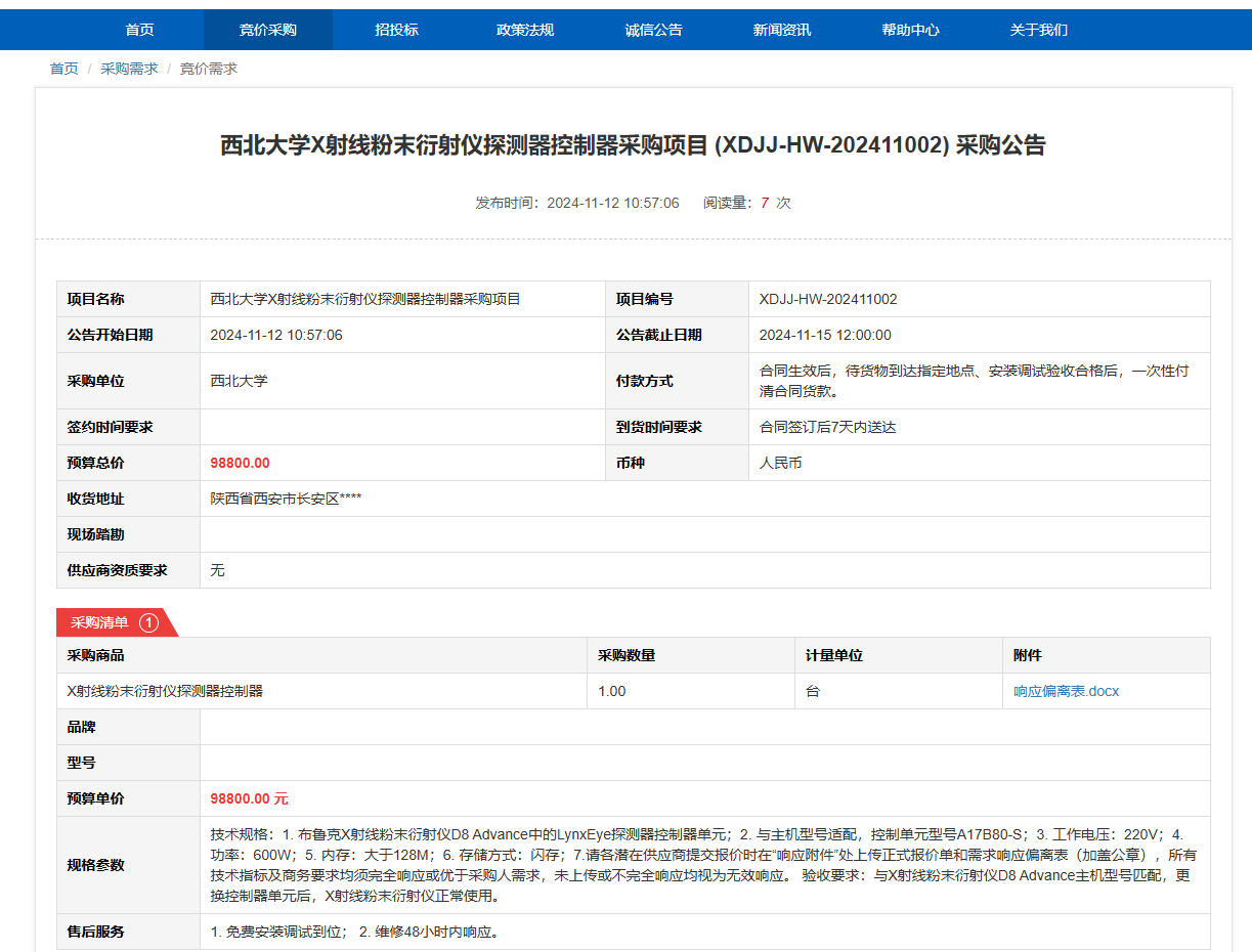 九游会在线登录官网X射线粉末衍射仪探测器控制器采购项目(XDJJ-HW-202411002)竞价采购公告 作者:采购与招标办公室 编辑: 时间:2024-11-12 原公告链接:https://www.ejingcai.com.cn/site/bidding/detail/14736