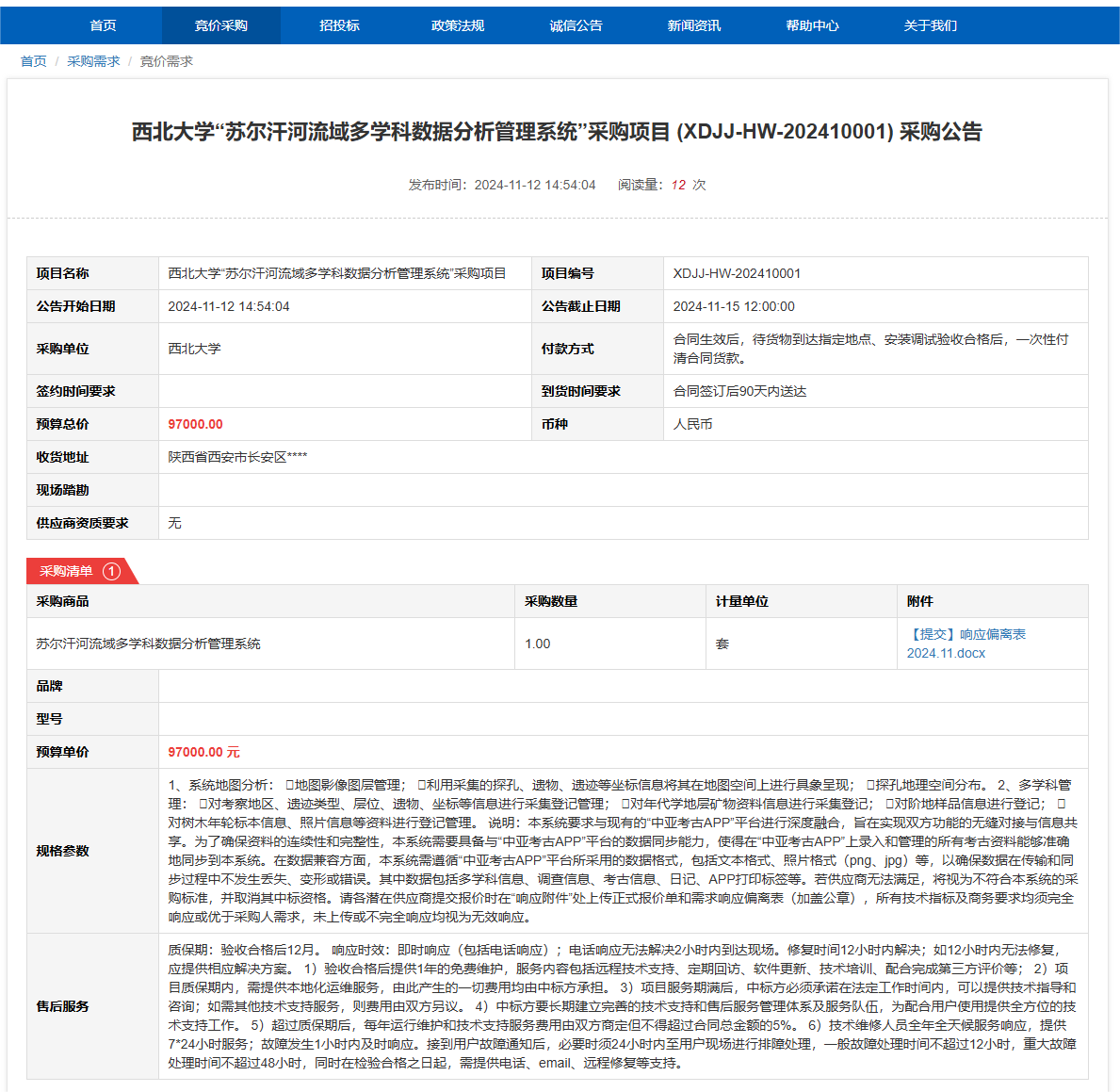 九游会在线登录官网“苏尔汗河流域多学科数据分析管理系统”采购项目(XDJJ-HW-202410001)竞价采购公告 作者:采购与招标办公室 编辑: 时间:2024-11-12 原公告链接:https://www.ejingcai.com.cn/site/bidding/detail/14753