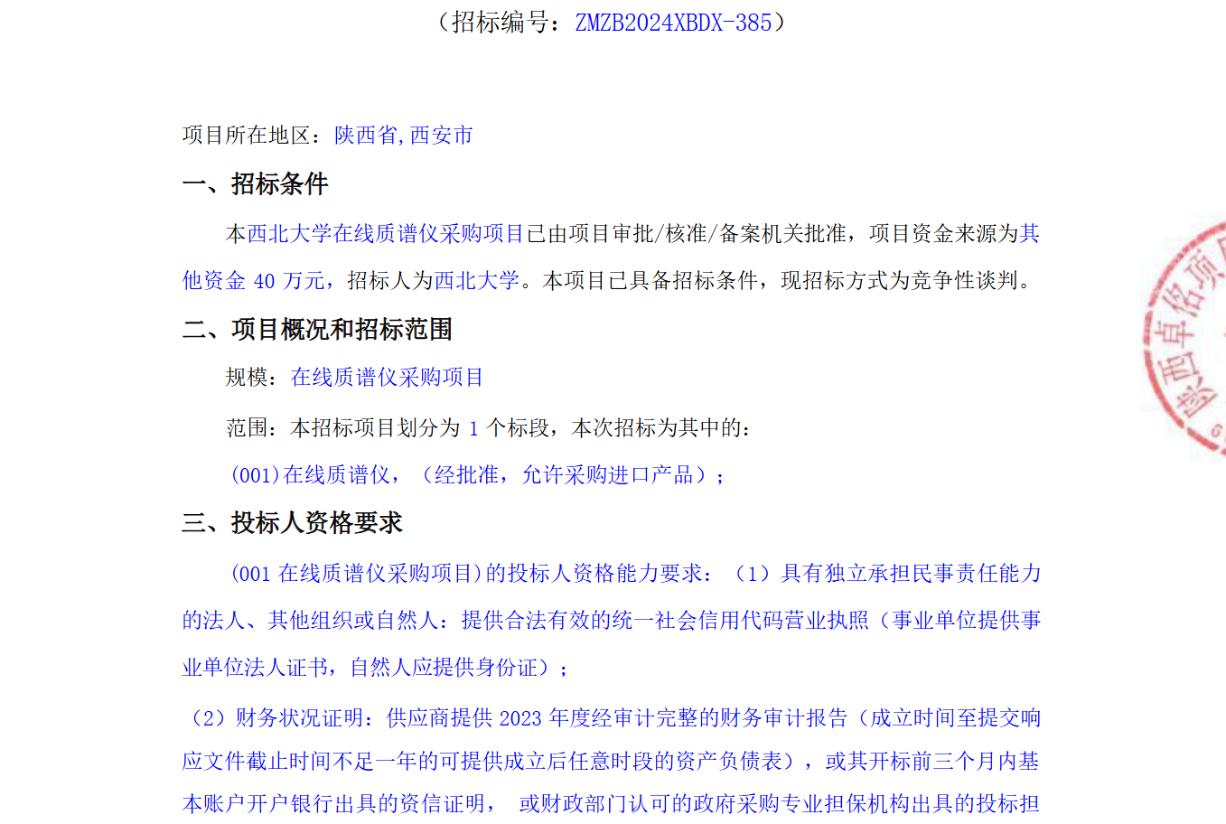 九游会在线登录官网在线质谱仪采购项目竞争性谈判公告 作者: 编辑:薛利娟 时间:2024-11-12 原公告链接:http://bulletin.sntba.com/biddingBulletin/2024-11-12/1982831.html