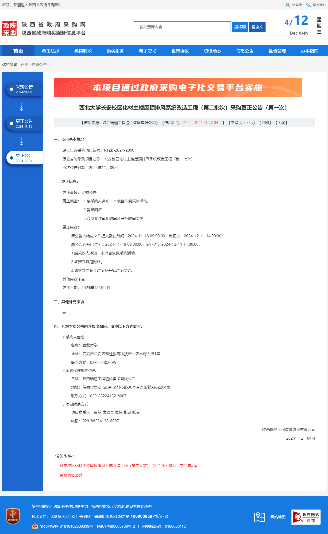 长安校区化材主楼屋顶排风系统改造工程(第二批次) 更正公告