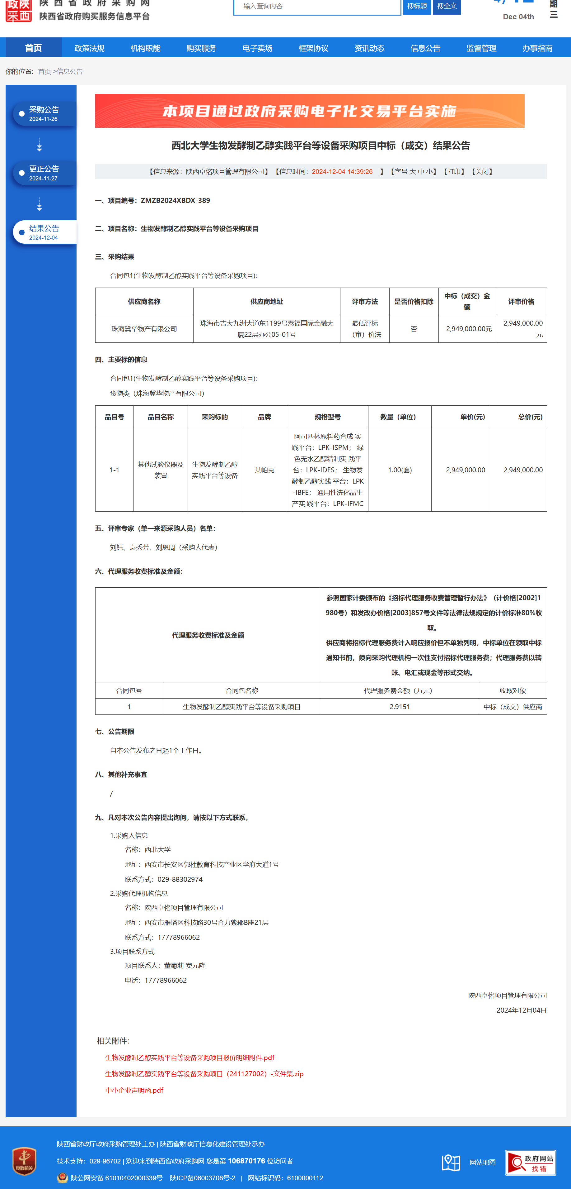 九游会在线登录官网生物发酵制乙醇实践平台等设备采购项目中标(成交)结果公告 作者:采购与招标办公室 编辑: 时间:2024-12-04 原公告链接:https://www.ccgp-shaanxi.gov.cn/freecms/site/shaanxi/ggxx/info/2024/8a69c5a59218576d0193905cb113521a.html?noticeType=001023¬iceId=1cad3dce-b20c-11ef-8063-08c0eb20c666