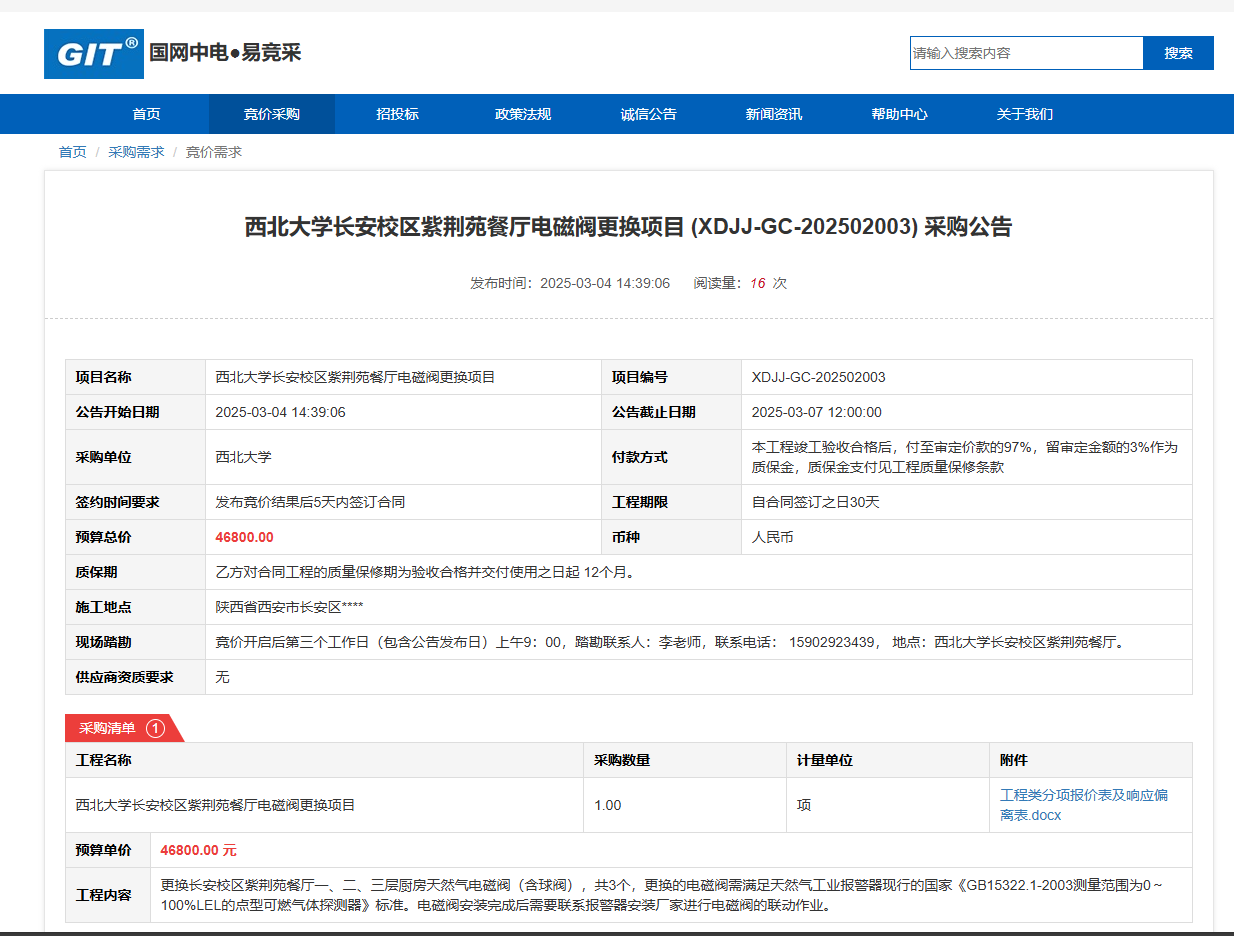 九游会在线登录官网长安校区紫荆苑餐厅电磁阀更换项目(XDJJ-GC-202502003)竞价采购公告 作者:采购与招标办公室 编辑: 时间:2025-03-04 原公告链接:https://www.ejingcai.com.cn/site/bidding/detail/16712
