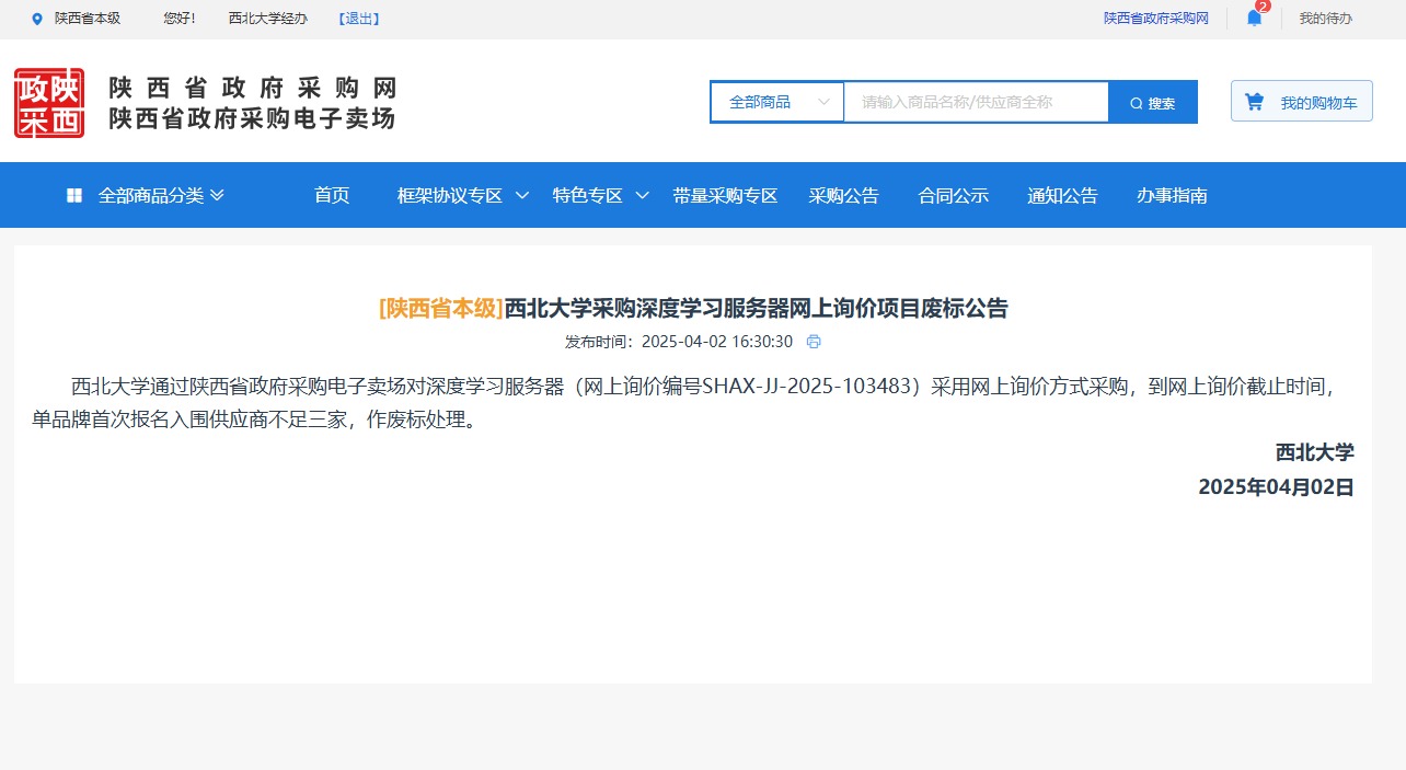 九游会在线登录官网采购深度学习服务器网上询价项目废标公告 作者:采购与招标办公室 编辑: 时间:2025-04-02 原公告链接:https://www.ccgp-shaanxi.gov.cn/gpmall-main-web/basic/noticeDetail?noticeGuid=7306497670795952128