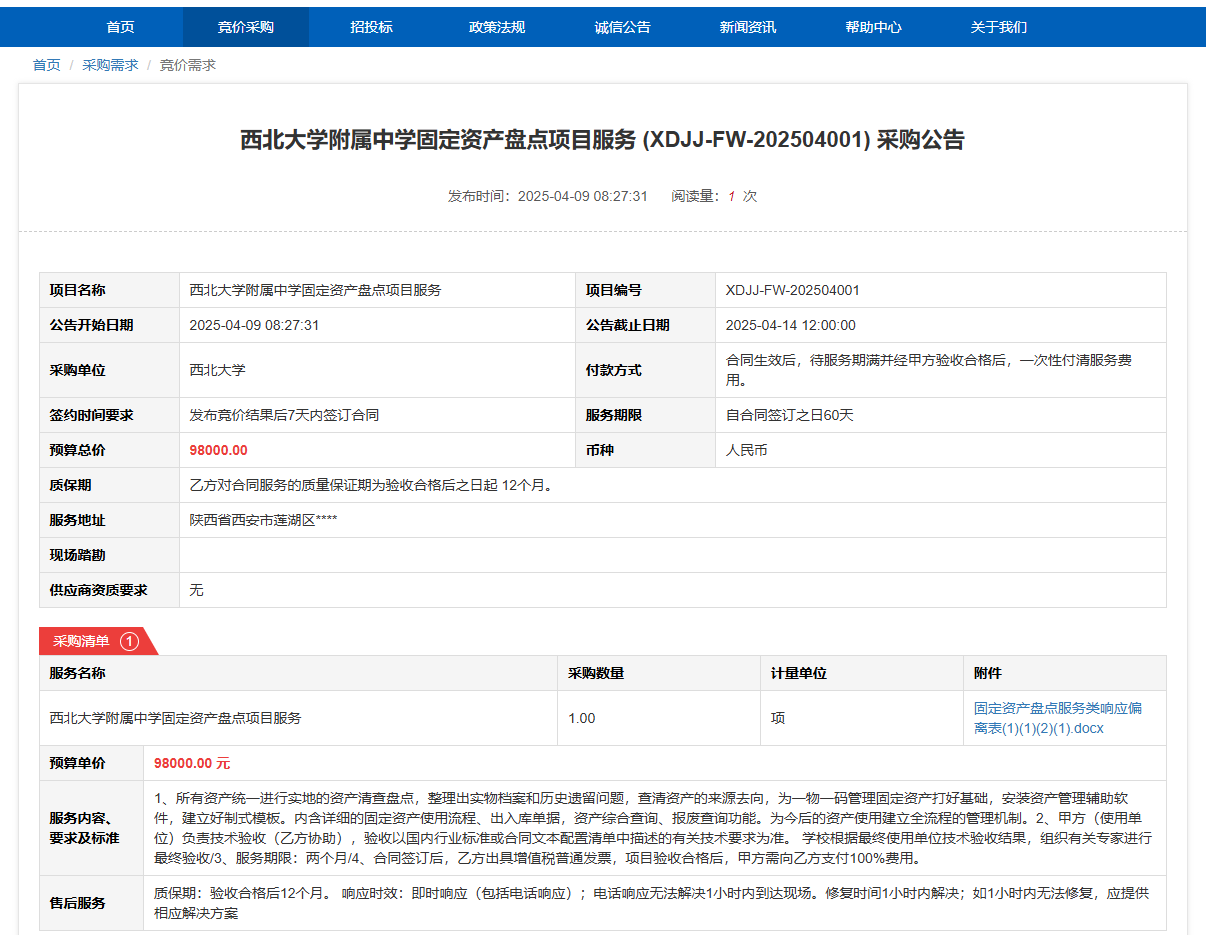 九游会在线登录官网附属中学固定资产盘点项目服务(XDJJ-FW-202504001)竞价采购公告 作者:采购与招标办公室 编辑: 时间:2025-04-09 原公告链接:https://www.ejingcai.com.cn/site/bidding/detail/17501