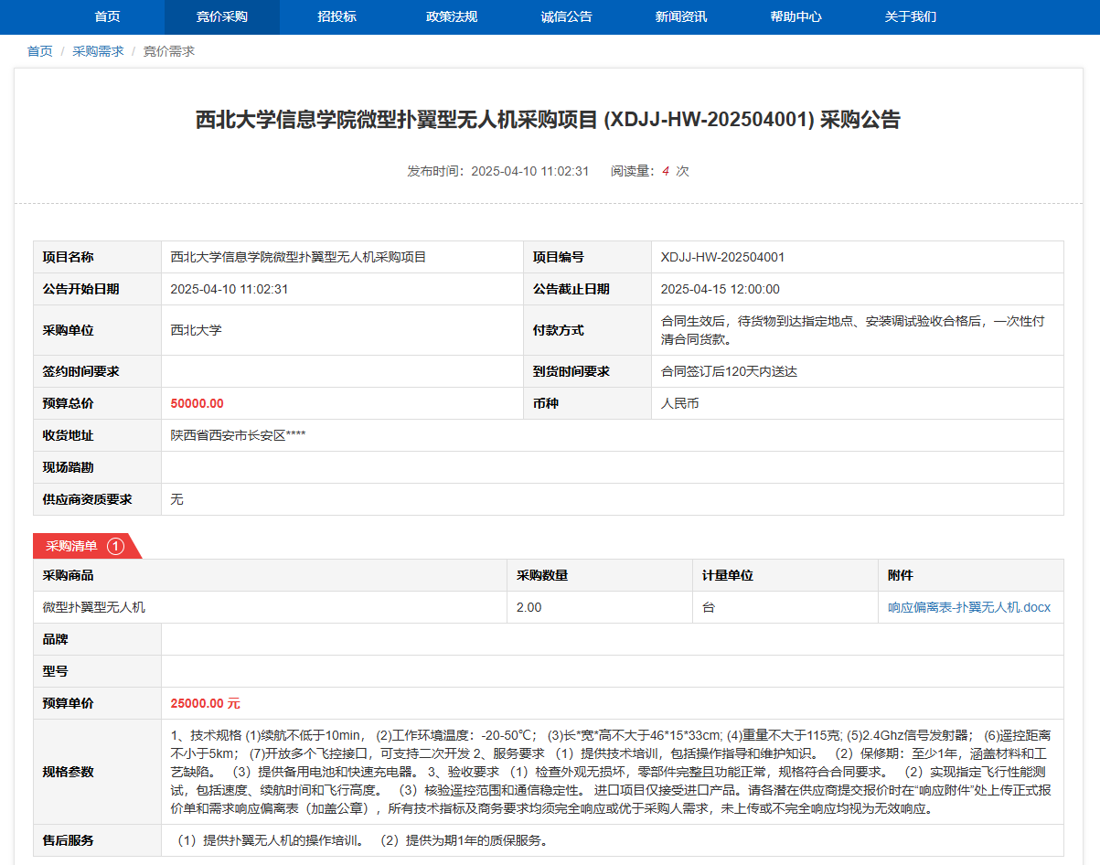 九游会在线登录官网信息学院微型扑翼型无人机采购项目(XDJJ-HW-202504001)竞价采购公告 作者:采购与招标办公室 编辑: 时间:2025-04-10 原公告链接:https://www.ejingcai.com.cn/site/bidding/detail/17536