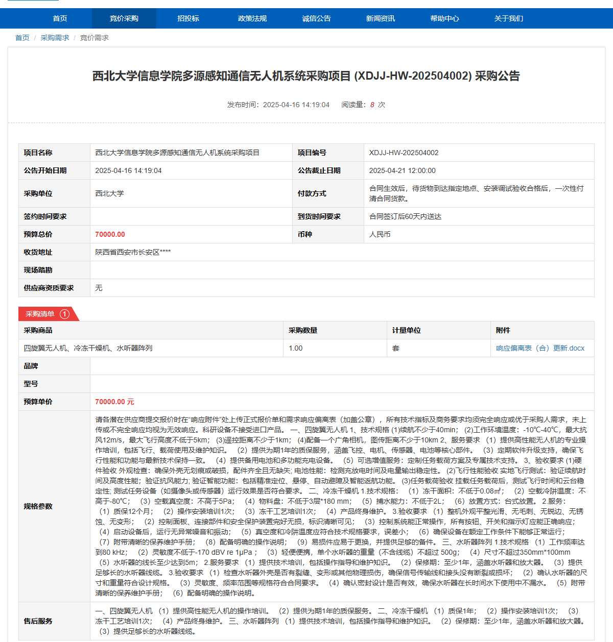 九游会在线登录官网信息学院多源感知通信无人机系统采购项目(XDJJ-HW-202504002)竞价采购公告 作者:采购与招标办公室 编辑: 时间:2025-04-16 原公告链接:https://www.ejingcai.com.cn/site/bidding/detail/17703