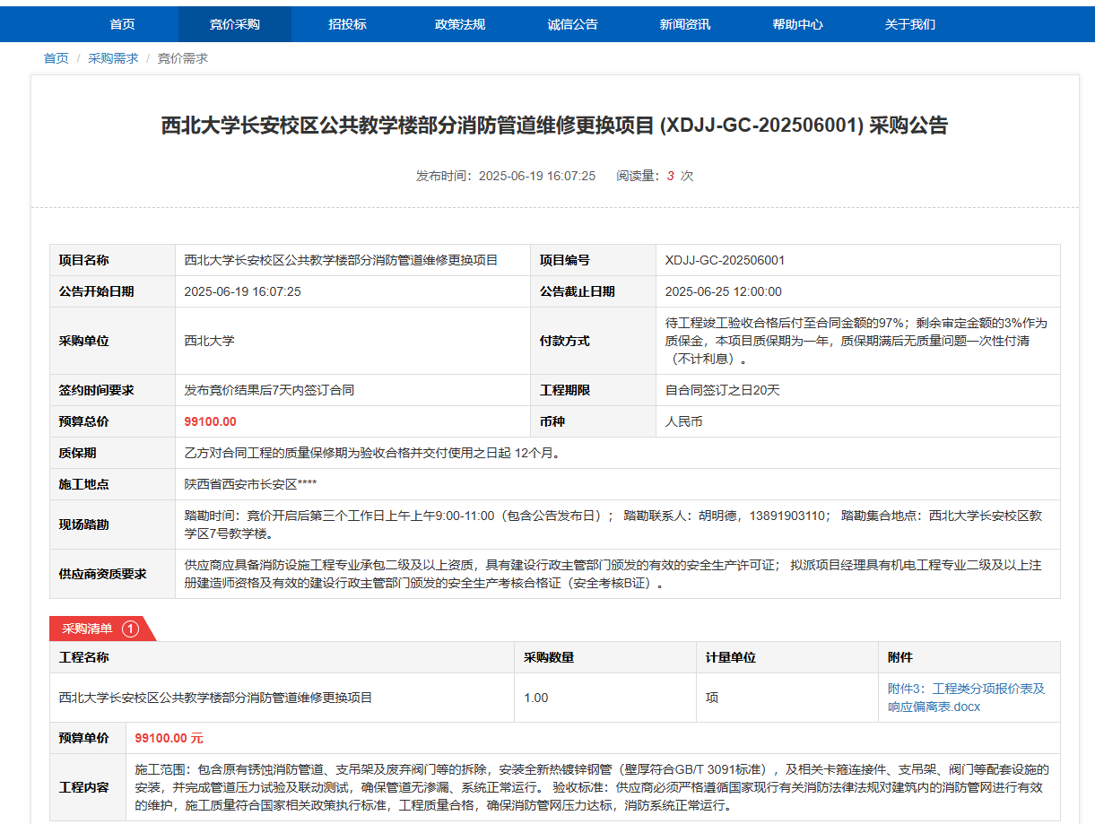 九游会在线登录官网长安校区公共教学楼部分消防管道维修更换项目(XDJJ-GC-202506001)竞价采购公告