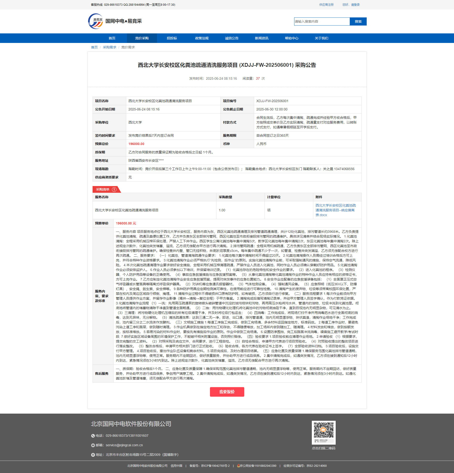九游会在线登录官网长安校区化粪池疏通清洗服务项目 (XDJJ-FW-202506001) 采购公告