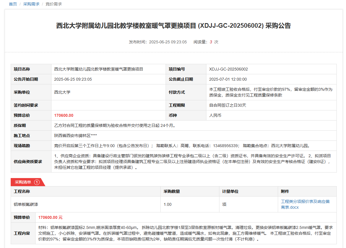 九游会在线登录官网附属幼儿园北教学楼教室暖气罩更换项目(XDJJ-GC-202506002)竞价采购公告 作者:采购与招标办公室 编辑: 时间:2025-06-25 原公告链接:https://www.ejingcai.com.cn/site/bidding/detail/19174