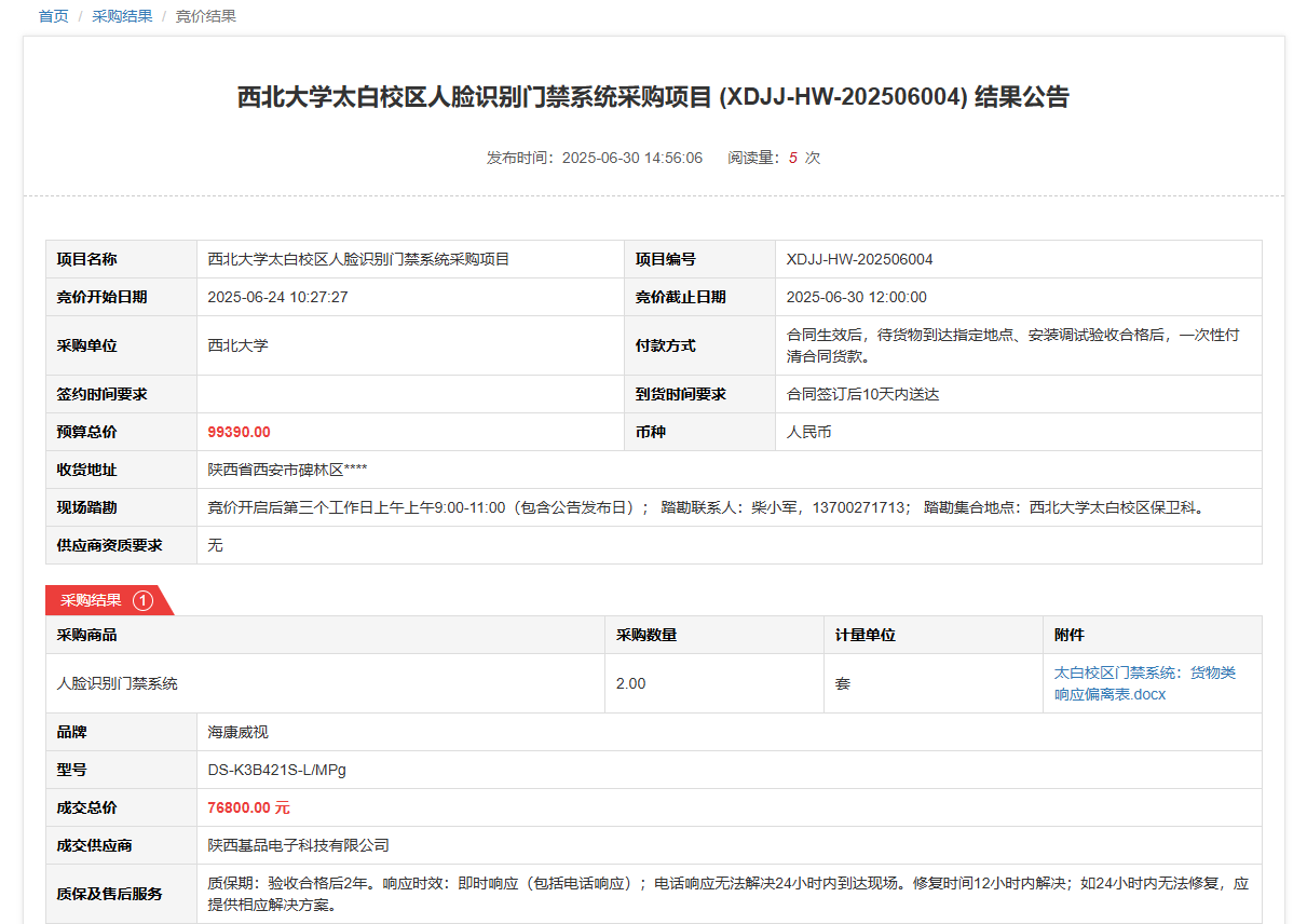 九游会在线登录官网太白校区人脸识别门禁系统采购项目(XDJJ-HW-202506004)竞价结果公告 作者:采购与招标办公室 编辑: 时间:2025-06-30 原公告链接:https://www.ejingcai.com.cn/site/bidding/detail/19250