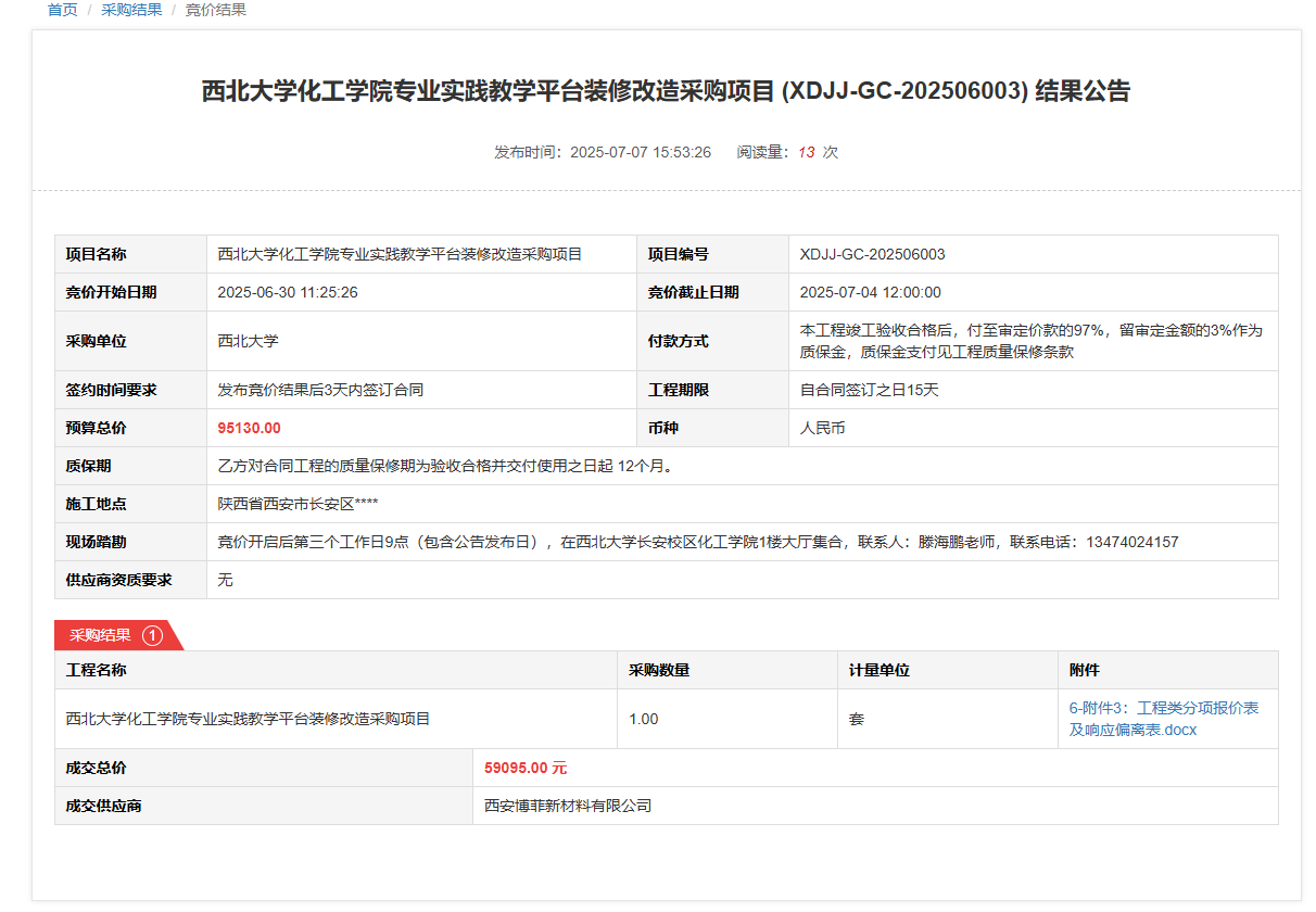 九游会在线登录官网化工学院专业实践教学平台装修改造采购项目(XDJJ-GC-202506003)竞价结果公告
