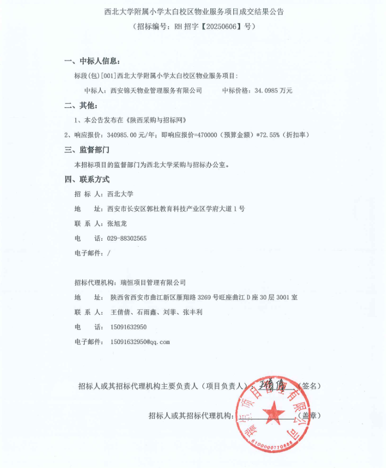 九游会在线登录官网附属小学太白校区物业服务项目成交结果公告