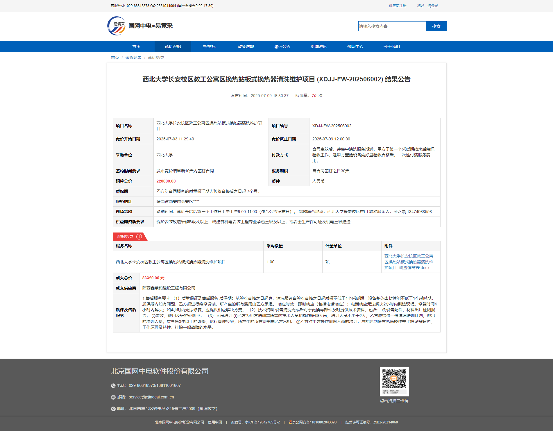 九游会在线登录官网长安校区教工公寓区换热站板式换热器清洗维护项目 (XDJJ-FW-202506002) 结果公告