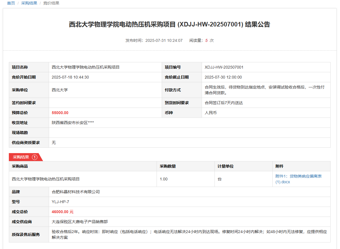 九游会在线登录官网物理学院液相色谱仪采购项目(XDJJ-HW-202507002)竞价结果公告