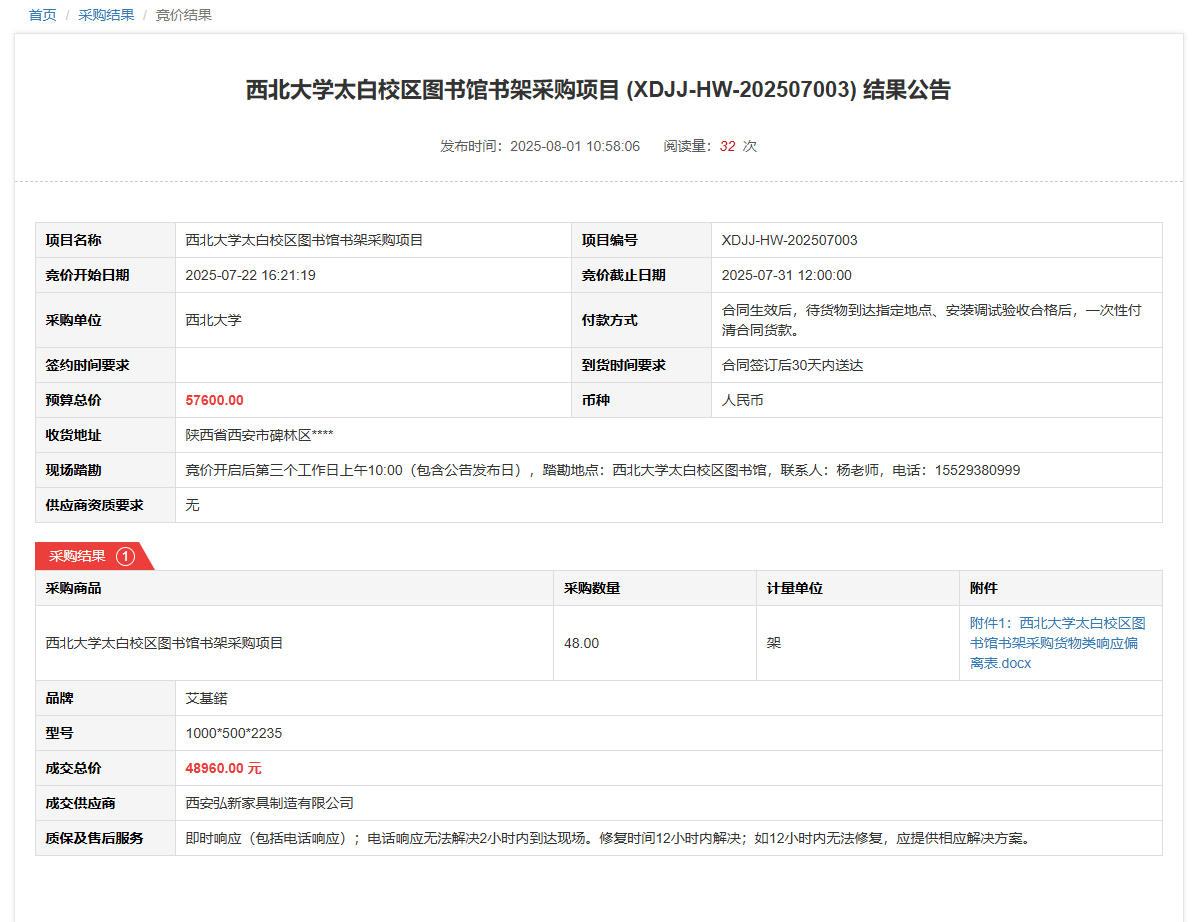 九游会在线登录官网太白校区图书馆书架采购项目(XDJJ-HW-202507003)竞价结果公告