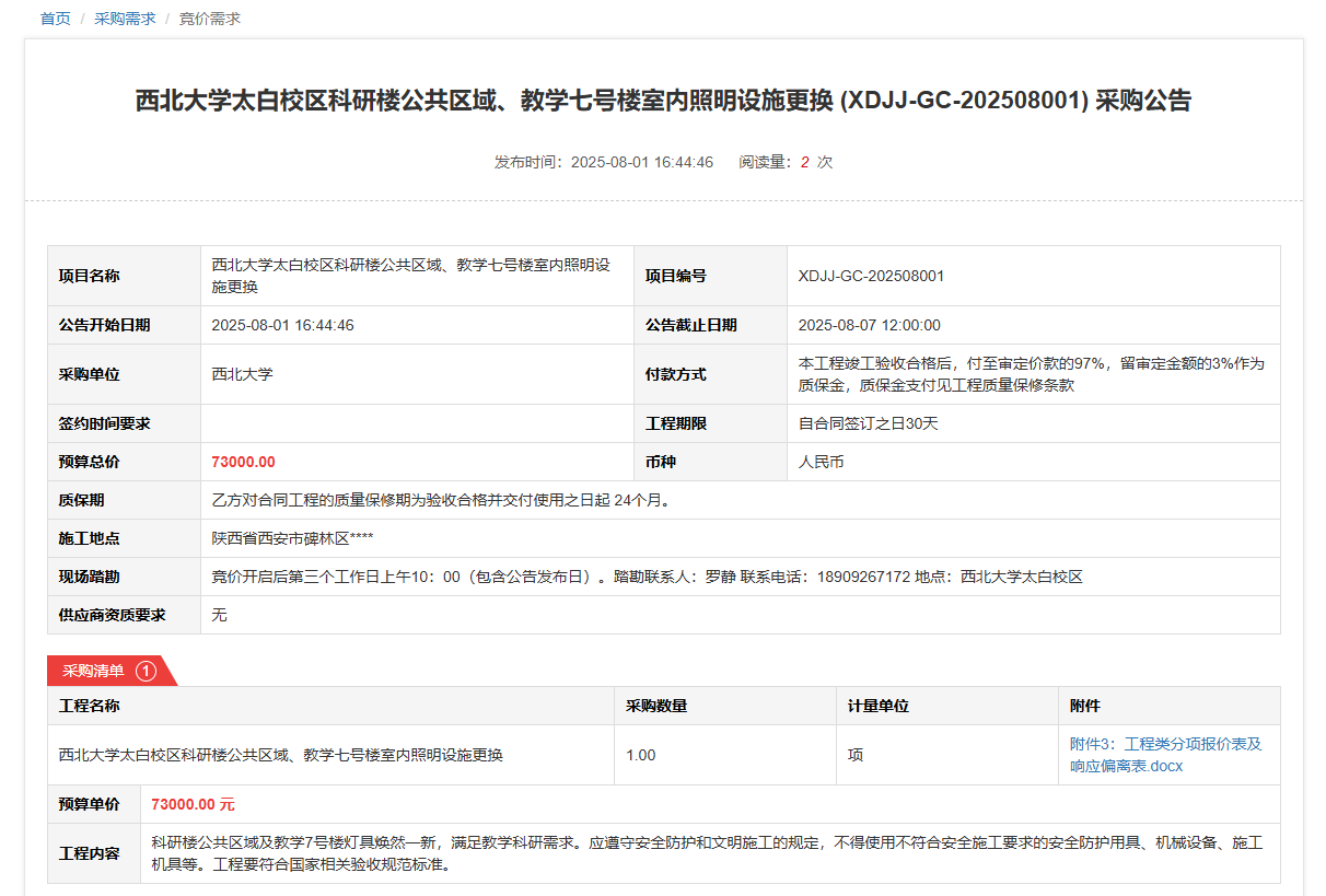 九游会在线登录官网太白校区科研楼公共区域、教学七号楼室内照明设施更换(XDJJ-GC-202508001)竞价采购公告