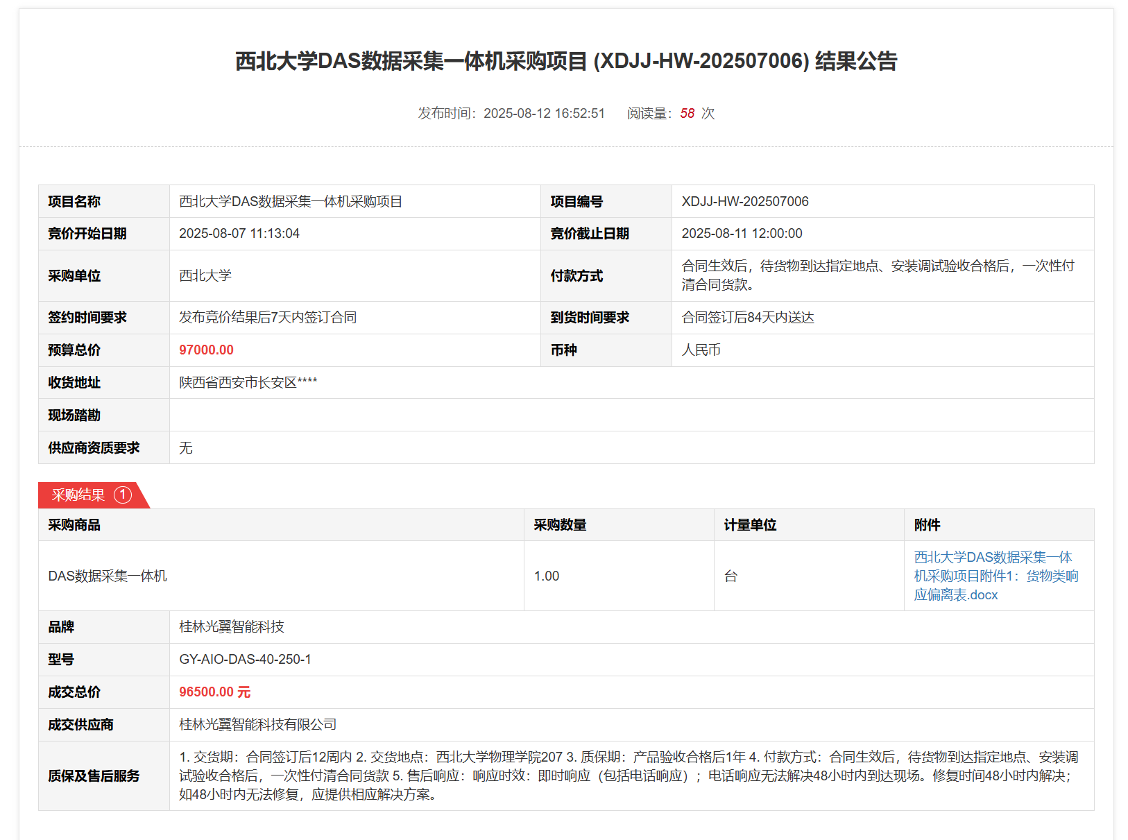 九游会在线登录官网DAS数据采集一体机采购项目(XDJJ-HW-202507006)竞价结果公告