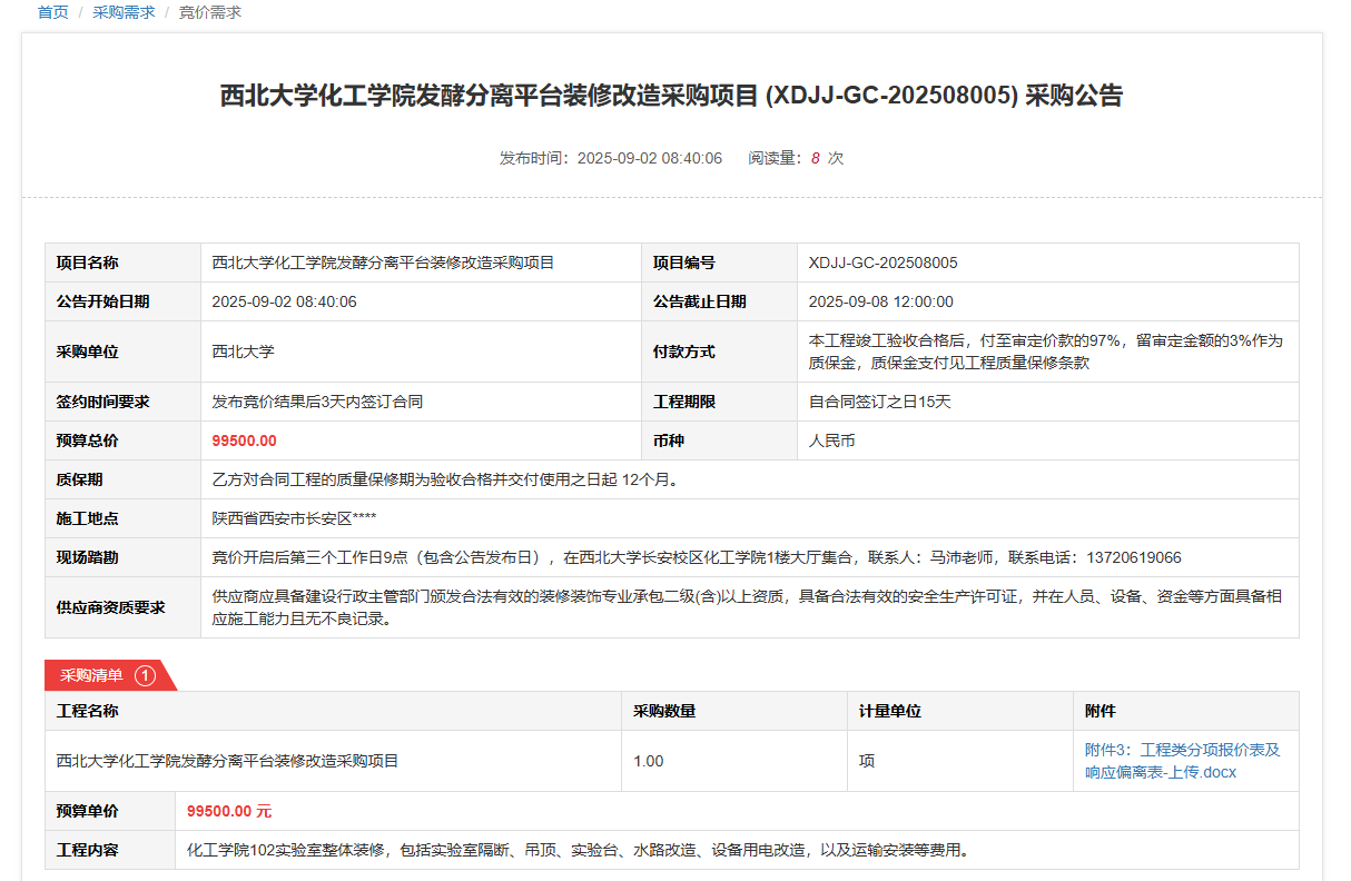 九游会在线登录官网化工学院发酵分离平台装修改造采购项目(XDJJ-GC-202508005)竞价采购公告