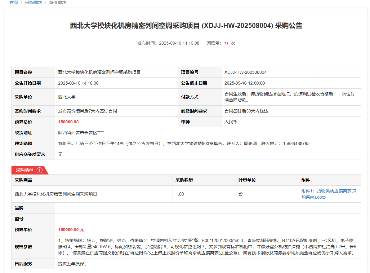 九游会在线登录官网模块化机房精密列间空调采购项目(XDJJ-HW-202508004)竞价采购公告