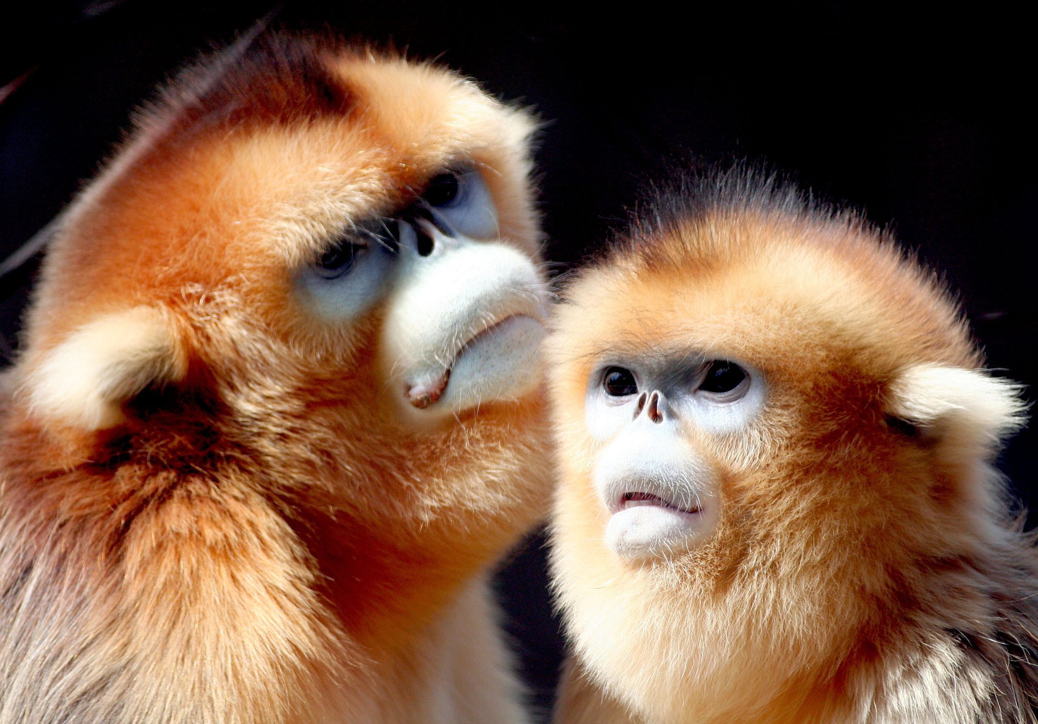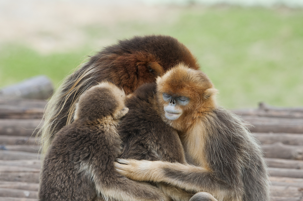 Qinling golden snub-nosed monkeys cuddle for warmth. /VCG