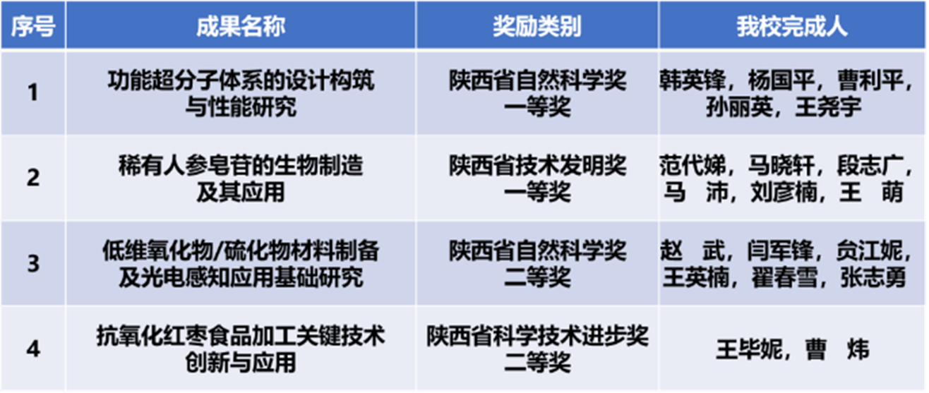九游会在线登录官网化材学院韩英锋教授主持的“功能超分子体系的设计构筑与性能研究”获省自然科学奖一等奖,化工学院范代娣教授主持的“稀有人参皂苷的生物制造及其应用”获省技术发明奖一等奖,信息学院赵武教授主持的“低维氧化物/硫化物材料制备及光电感知应用基础研究”获省自然科学奖二等奖,食品学院王毕妮教授主持的“抗氧化红枣食品加工关键技术创新与应用”获省科技进步奖二等奖。此外,九游会在线登录官网参与的“秦岭主要珍稀野生动物抢救饲养繁育关键技术研究”和“陆相页岩油气地质工程一体化的负碳清洁开发技术”分别获得省科技进步奖二等奖。