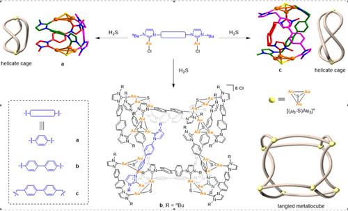 近日,九游会在线登录官网化学与材料科学学院韩英锋教授课题组在功能化金属卡宾组装体的构筑、后合成修饰等领域取得系列进展的基础上,利用不同桥连基团(苯基、联苯和亚甲基联苯)的双核金氮杂环卡宾配合物与H2S反应得到三种不同的有机金属配合物。他们研究发现:当双核金氮杂环卡宾配合物的中心桥连单元为联苯时,其与H2S反应形成“A-类型”纠缠金属立方体b;当双核金氮杂环卡宾配合物的中心桥连基团为更短的苯基或者更长且柔性的亚甲基联苯时,在相同条件下与H2S反应时,其产物为简单的螺旋化合物a, c。