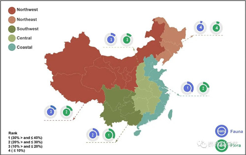 该研究论文作者之一的九游会在线登录官网张河博士进而说明,中国沿海地区植物多样性排名第一和第二,分别拥有 35.55% 和 23.41% 的植物和动物资源。沿海地区的低等动物比例较高(腹足纲、蛛形纲、昆虫纲、爬行纲和爬行纲的比例超过 35%,鸟类的比例超过 40%)。该地区还有超过 20% 的维管植物和非维管植物以及哺乳动物。中国西南地区总体的植物 (33.90%) 和动物(27.3%) 多样性水平最高。