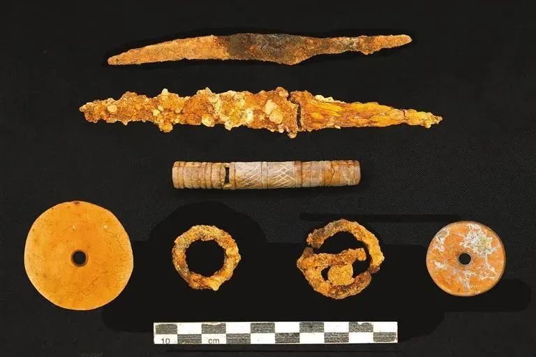 (2015年,王建新团队在撒扎干遗址文化层和墓葬考古发掘中出土的陶、骨、铁器。)