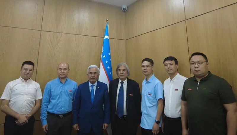 (日前,正在乌兹别克斯坦出访的王建新(中)一行与乌方有关负责人合影。)