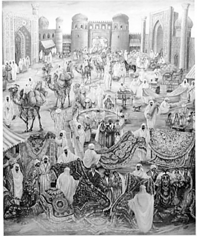 萨德尔巴耶夫从艺术学校毕业后,在哈萨克斯坦博物馆做修复工作。他到中国参观了博物馆,认真研究丝绸的生产和流通过程。后来,他遍访了高加索、土耳其、里海和伏尔加河地区的所有历史名城,详细研究中亚国家档案历史。创作了近百幅关于“丝绸之路”主题的画作。他创作的全景画《哈萨克阿尔泰古代游牧民族的祭祀仪式》(图③),因其幅面巨大而载入吉尼斯世界纪录。他的由24幅作品构成的一系列绘画,展示了从东起公元8-14世纪喀喇汗国开阿利克、西到哈萨克斯坦阿特劳的萨拉伊克的地理空间、历史文化全景风貌。萨德尔巴耶夫还创作了一部小说,描述生活在丝绸之路上的贸易路线、民族和部落,展示他们的传统、仪式和文化娱乐,描述了古代建筑、宫殿、商队、食物和烹饪等。其中的绘画插图,均为作者的丝绸之路题材创作。