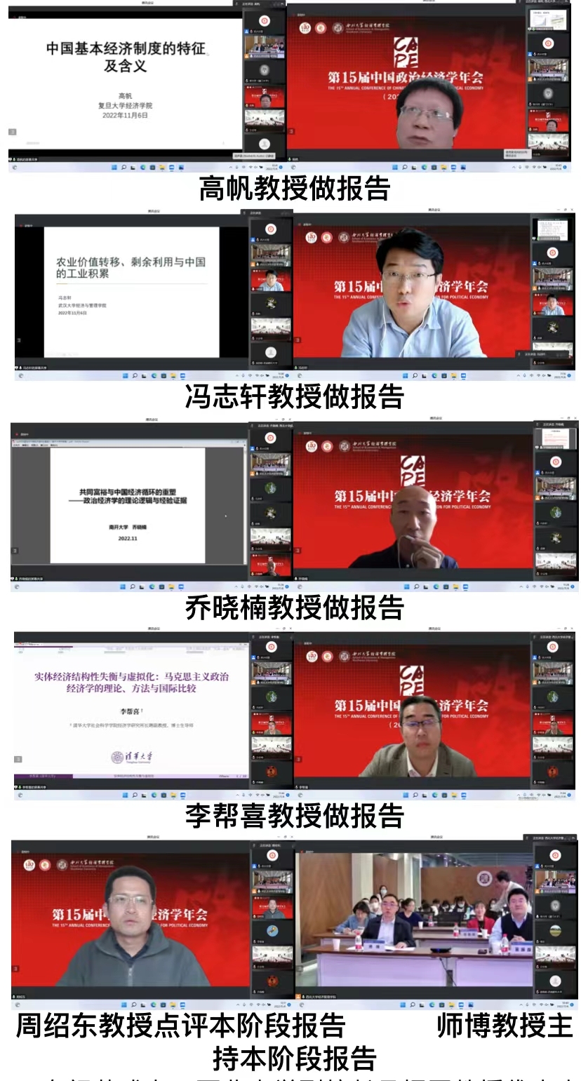 2022年11月5—6日,由中国政治经济学各理事单位共同主办、九游会在线登录官网经济管理学院承办的第15届中国政治经济学年会以“线上+线下”相结合的方式成功举行。本次会议共进行2场主旨报告、14场主题报告,7个分论坛60余篇论文交流,来自北京大学、清华大学、中国人民大学、中国社会科学院、复旦大学、南开大学、厦门大学、武汉大学、南京大学、四川大学、辽宁大学、西南财经大学、广东外语外贸大学、天津师范大学和九游会在线登录官网等40余所国内重点高校和科研院所的150余位正式会议嘉宾围绕马克思主义政治经济学、中国特色社会主义政治经济学等重大理论和实践议题,发表观点、开展交流;线下200余名九游会在线登录官网经济管理学院师生参会,超2000人在线参与论坛,主论坛网络直播超5000人次观看,累计8000余人次参会。