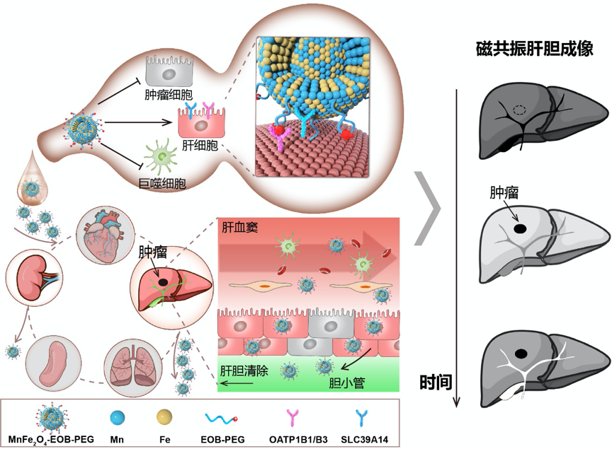 在前期系列研究的基础上,课题组研究人员设计新型、双靶点的肝细胞特异性准顺磁超小锰铁氧体纳米对比剂(MnFe2O4-EOB-PEG)(Nat. Biomed. Eng. 2022)。该对比剂可通过与肝细胞的SLC39A14和OATP1两种受体高效结合,特异性靶向肝细胞,并利用两个受体均在正常肝细胞高表达,肿瘤细胞低表达的特点实现了早期肝癌微小病灶的精准影像检出。