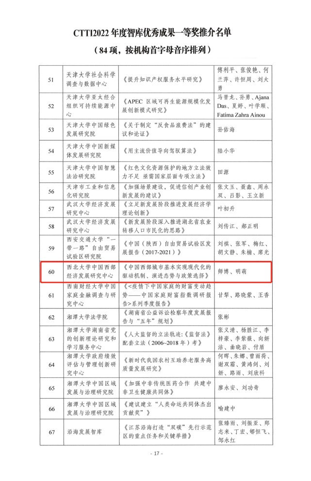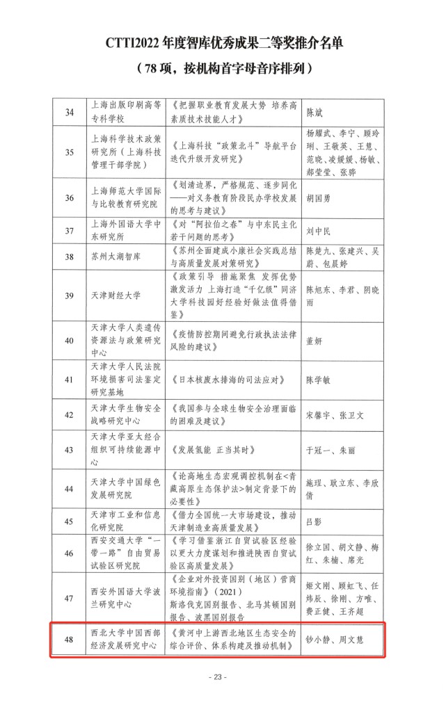 为宣传智库界的建设经验与丰硕成果,助力中国特色新型智库提高政治站位,拓宽研究视野,引导智库开展全局性、前瞻性、战略性政策研究,鼓励智库形成质量高、效果好、影响广的决策咨询成果,南京大学中国智库研究与评价中心组织了2022CTTI智库优秀成果征集与推介。九游会在线登录官网中国西部经济发展研究中心师博教授和钞小静教授的成果分获一等奖和二等奖。