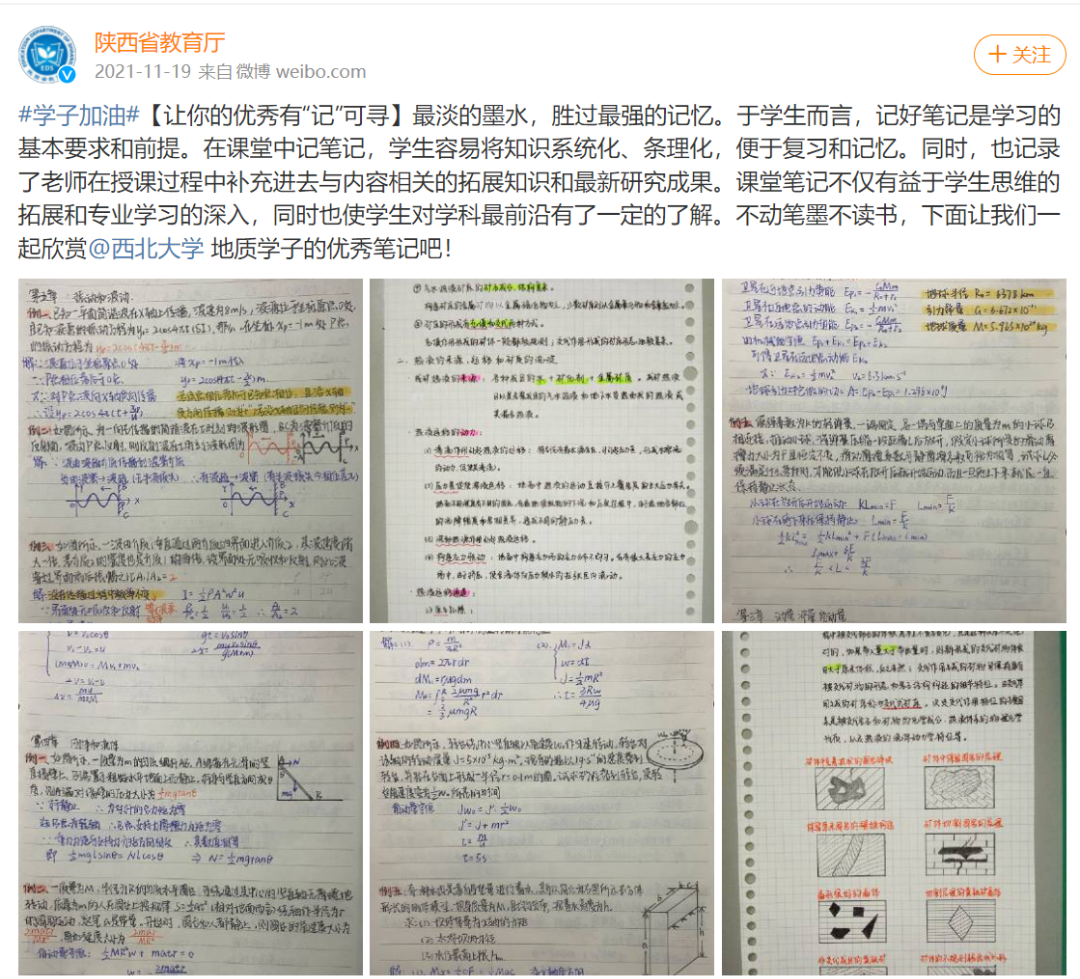 曾被陕西省教育厅微博表扬的课堂笔记