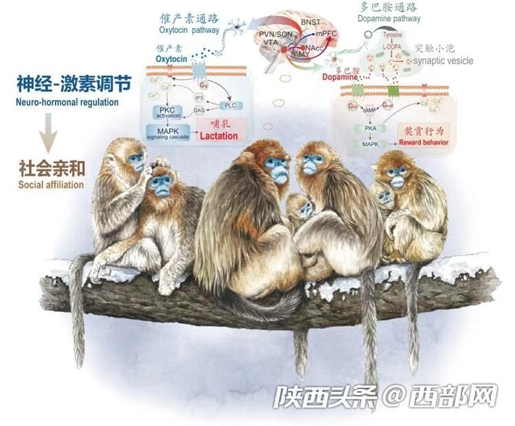 通过比较基因组学的方法,结合系统发育分析检测的结果显示,历史上的寒冷事件促进了亚洲叶猴的能量代谢和神经-激素调节相关基因受到正选择,演化出了更加有效的脑、神经-激素调控网络,其中在奇鼻猴类群中与催产素、多巴胺递质系统有关的基因改变格外引人注目:其类群的社会呈现两步式的逐步聚合模式,从祖先的“一夫多妻”到形成具有分离-聚合特征的类重层社会,再演化出“家庭”长期生活在一起的大型重层社会。