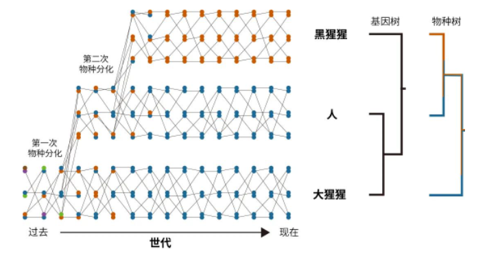 其中一篇主要论文还对灵长类中导致基因树和物种演化树冲突的不完全谱系分流现象进行了系统研究。“该现象是指生物祖先的一部分基因多态性被随机分流到分化出的不同物种的情况,这会造成亲缘关系较远的物种间在某些基因上存在相似性。例如,人与黑猩猩的亲缘关系比大猩猩更近,但事实上,在人的基因组里却有超过15%的基因组区域跟大猩猩更相似。可见,不完全谱系分流会对获得正确的演化关系造成干扰。”张国捷说。基于此研究,他的团队与丹麦奥胡斯大学的米凯尔·舒尔普(Mikkel H. Schierup)等研究者提出一套全新的分子钟算法,既考虑了不完全谱系分流现象,又可以不依赖化石年代记录,准确获得灵长类的物种分化时间。