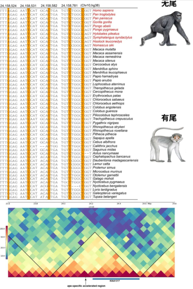 可能导致猿类尾巴丢失的基因演化情况(张国捷课题组和吴东东课题组合作供图)