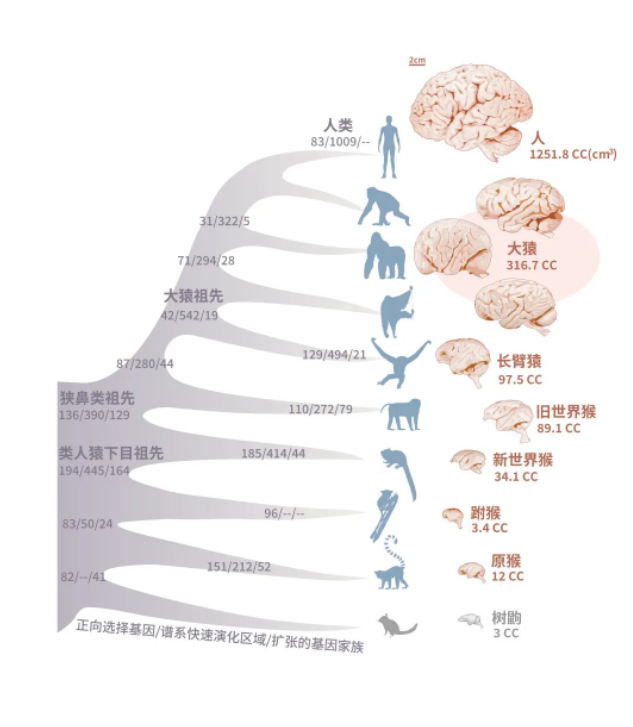灵长类物种脑容量演化历程以及基因组变化(张国捷课题组和吴东东课题组合作供图)