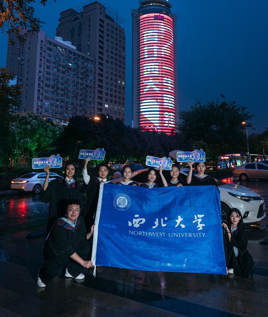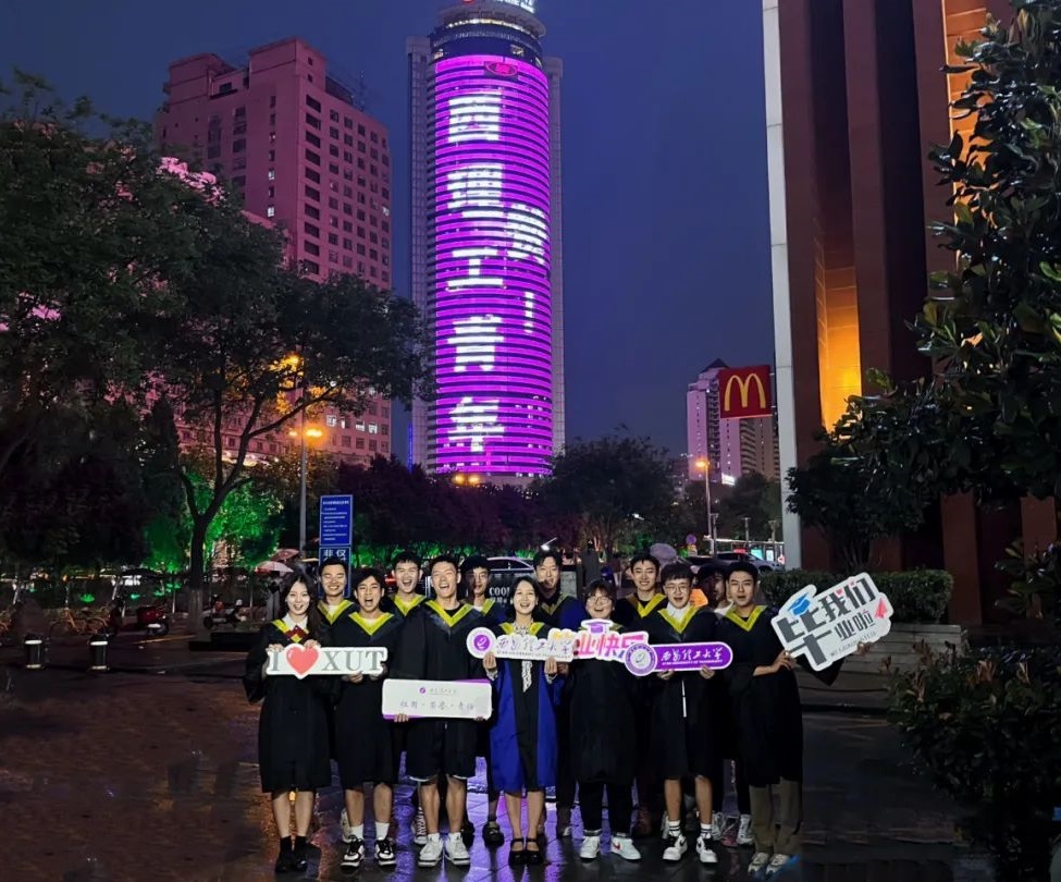 “从总师摇篮启航 共赴星辰大海”“西大青年 顶峰相见”“@来自长大的你,毕业快乐”……华灯初上,车水马龙,位于城市中心的陕西信息大厦户外大屏被点亮,百米大屏上滚动着带有祝福文字和图案。