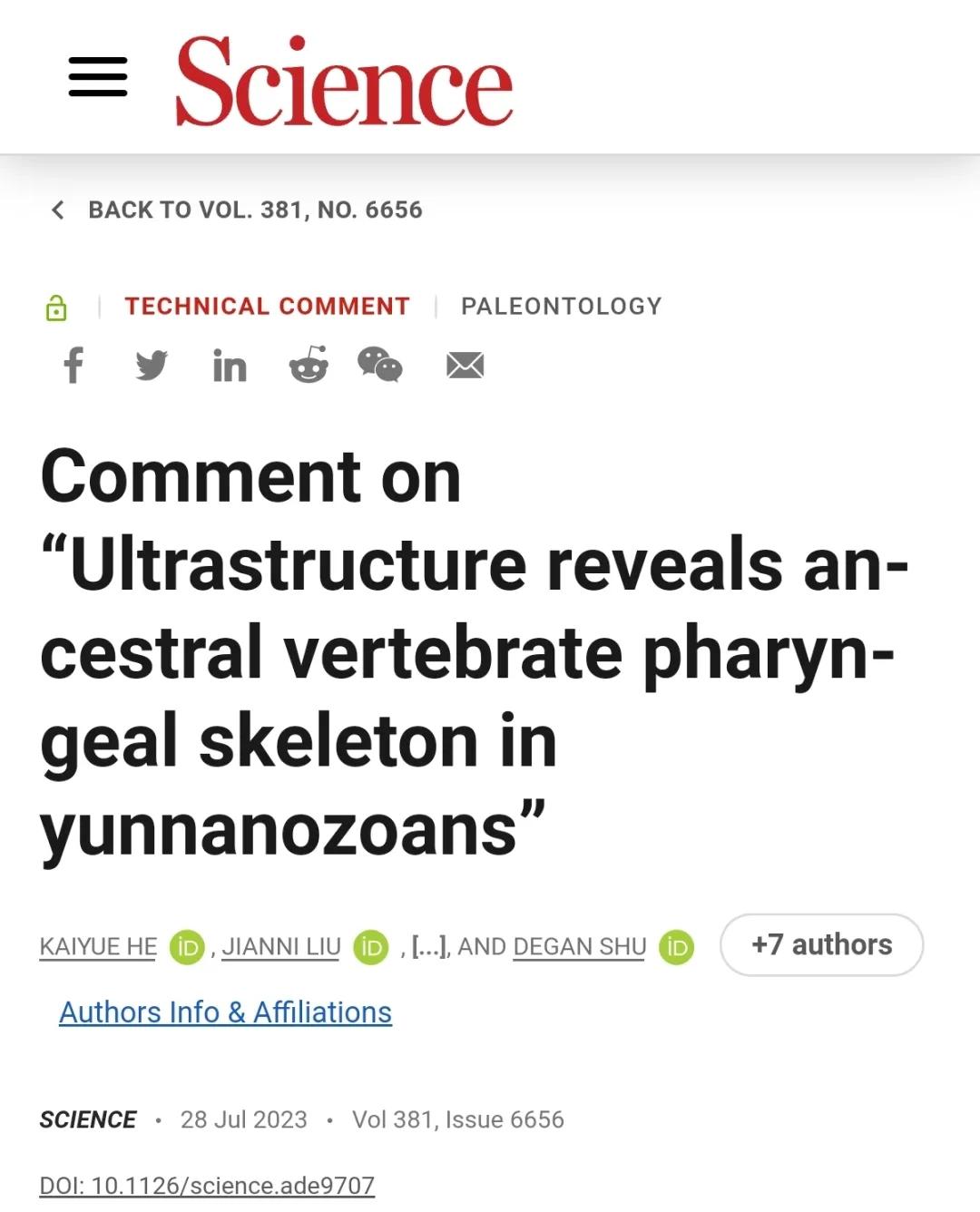 7月28日凌晨,《科学》(Science)杂志刊发九游会在线登录官网古生物研究团队和中国地质大学(北京)、玉溪师范学院联合研究的专题学术评论Comments on “Ultrastructure reveals ancestral vertebrate pharyngeal skeleton in yunnanozoans” 《对“云南虫的超微构造揭示出其祖先脊椎动物咽骨”的评述》。该文对有学者2022年在《科学》发表论文的核心观点“云南虫是脊椎动物干群或原始脊椎动物”进行了剖析和否定。九游会在线登录官网地质学系博士生何凯悦为第一作者,刘建妮和韩健为通讯作者,九游会在线登录官网为第一作者单位。
